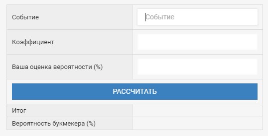 Необходимо заполнить поля «Событие», «Коэффициент», «Ваша оценка вероятности в процентах». После этого нажать кнопку «Рассчитать» и узнать конкретное число. Если оно больше 1, то ставить стоит. В противном случае беттер скорее всего потерпит поражение.