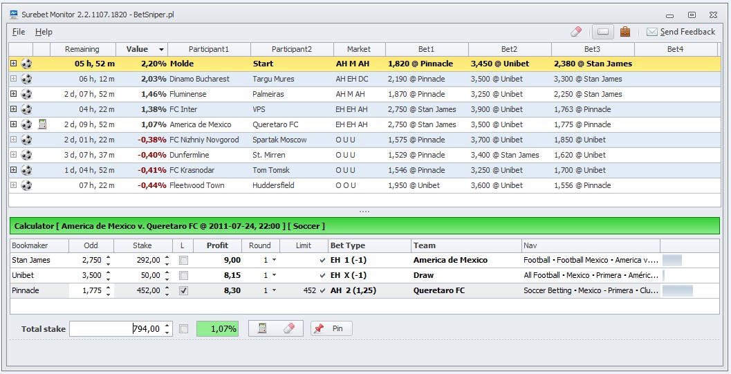 Сервис SureBet способен выводить до десятка тысяч ценных ставок за день. Анализируется линия более 70 букмекерских контор. Иногда бывают колебания, сбои в системе, когда число исследуемых коэффициентов уменьшается. Переоцененные прогнозы отфильтрованы в порядке уменьшения возможности прохода. Вверху списка располагаются самые вероятные – 95% и выше.