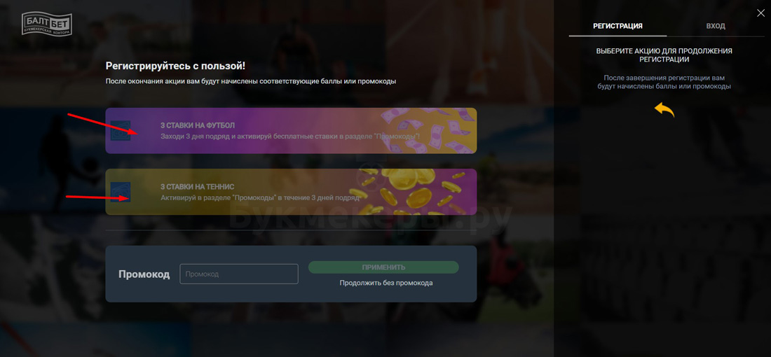 Применить код можно при создании аккаунта или уже после него. Чтобы зарегистрироваться в Baltbet по промокоду, необходимо: