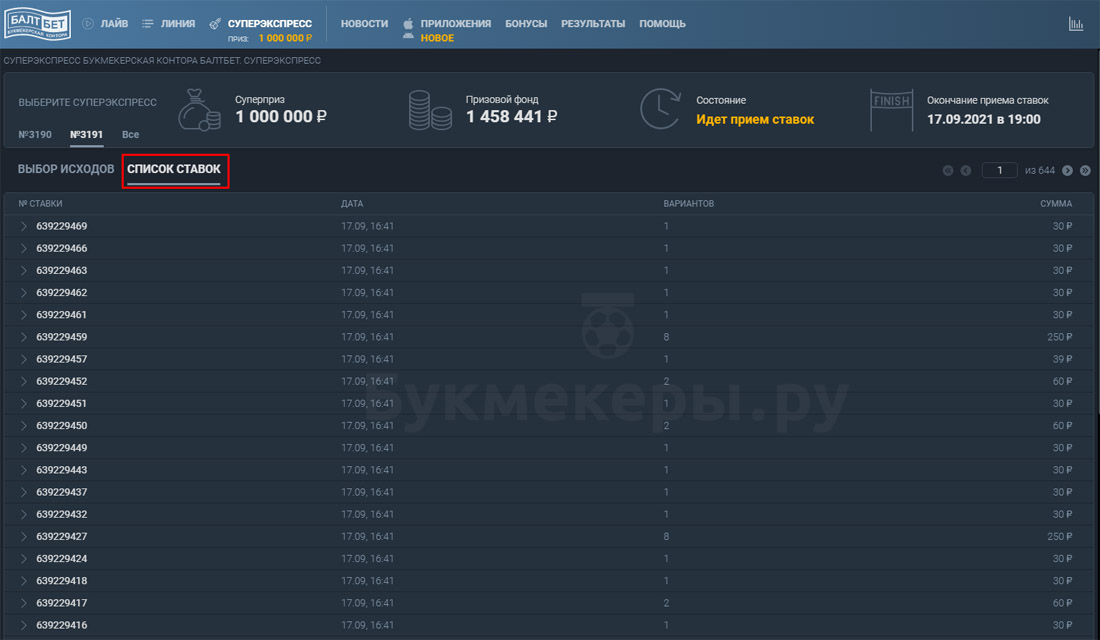 Играть в тото в букмекерской конторе baltbet.ru может каждый зарегистрированный посетитель, прошедший верификацию. 15 –– минимальное число прогнозов в суперэкспрессе. Ставить предлагается на футбол. Для каждого из матчей доступно 3 варианта исходов. То есть при желании ставка может включать до 45 прогнозов. Каждый дополнительный вариант сверх 15 обязательных увеличивает минимальный размер пари.