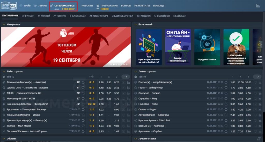 Прежде всего нужно авторизоваться в БК Балтбет ру. Доступна как новая, так и старая версия сайта. Кроме того, можно зайти через мобильное приложение. Раздел Супер экспресс Балт Бет находится вверху главной страницы рядом с линией, Live и новостями. Здесь игрок заполняет купон из 15 событий, желающим сделать прогноз без лишних усилий доступна опция «Случайный выбор». После ее активации программа сама выберет 15 обязательных пари.