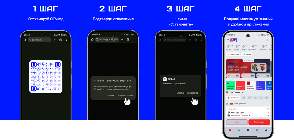 Приложение букмекерской конторы Бет-М — это удобный и безопасный софт, который пользователи могут скачать на свои устройства, чтобы получить доступ ко всем привилегиям игры. Такой софт занимает не более 30 Мб свободной памяти девайса, открывает доступ ко всем функциям и управлению аккаунтом. Участникам предлагается пошаговая инструкция установки на официальном сайте БК Бет-М, а более подробно мы рассмотрим требования ниже.