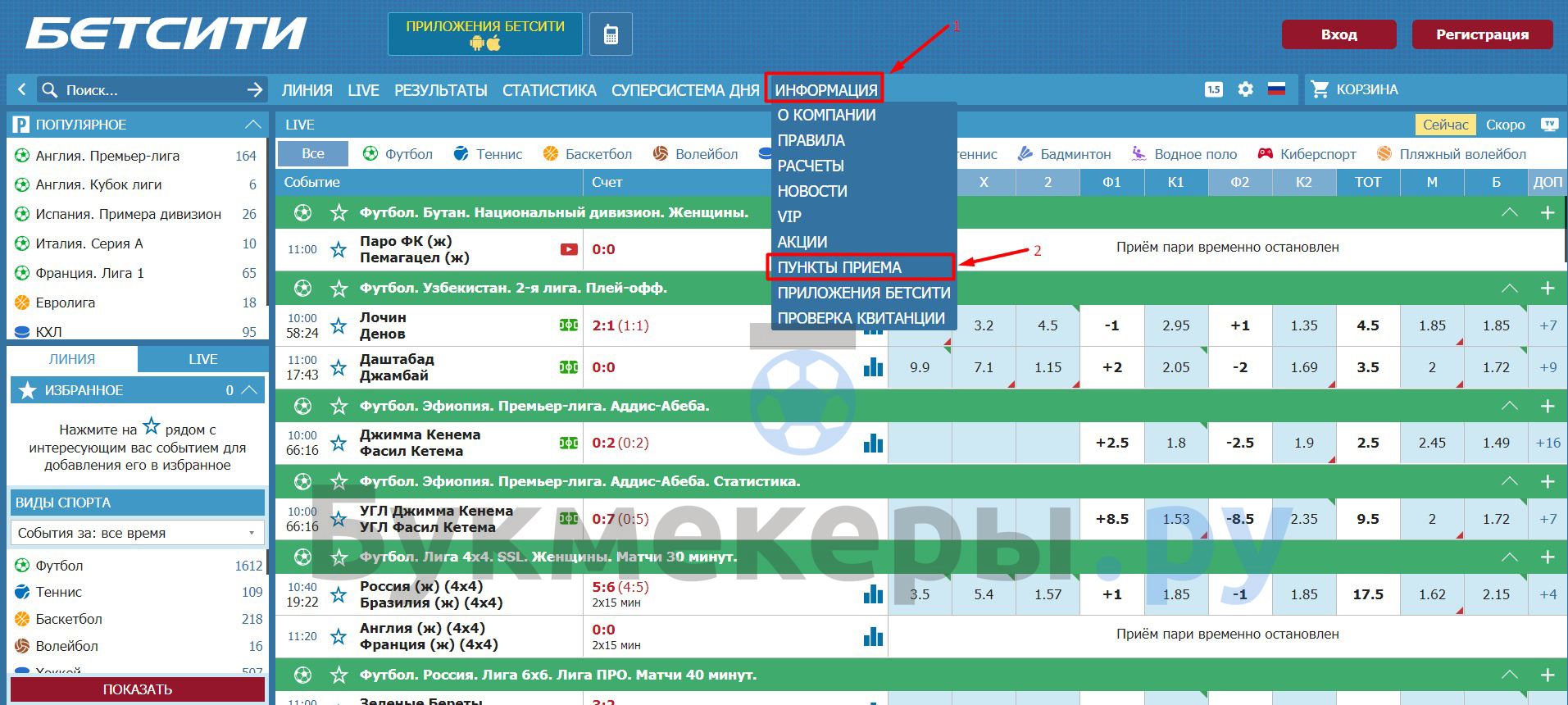 Букмекерская контора Бетсити принимает ставки не только через интернет, но и в стационарных пунктах (ППС). Их наибольшее количество находится в Москве – основная масса в пределах МКАД – 17. Полный и актуальный перечень адресов по всем городам России, представлен на официальном сайте БК, в разделе «Информация», «Пункты приема».