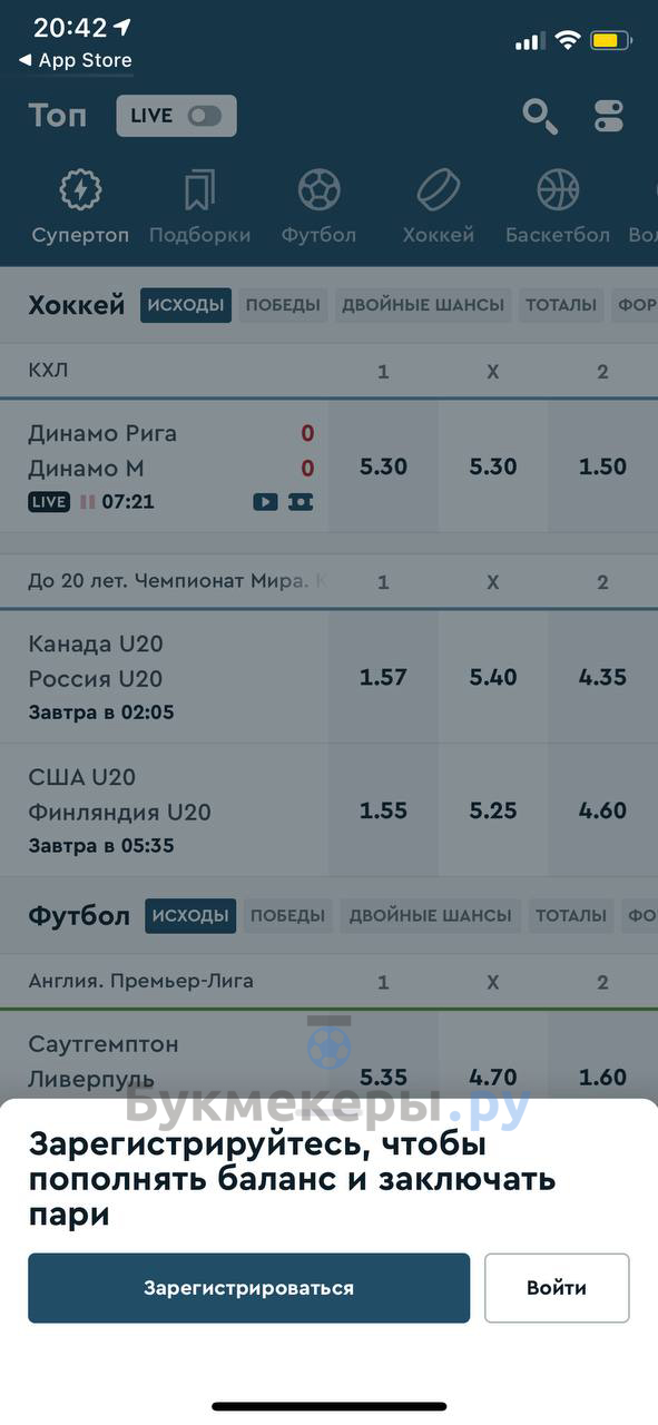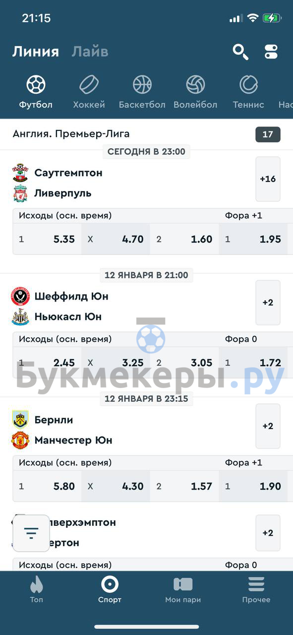 Заключение пари. В приложении доступны ставки на 20+ видов спорта. Они представлены в разделах «Лайв» и «Линия», наиболее популярные игры, идущие в режиме реального времени. Роспись не урезана. В настройках профиля можно выбрать удобное отображение событий. Чтобы долго не листать ленту, рынки с большим количеством исходов открываются дополнительно.