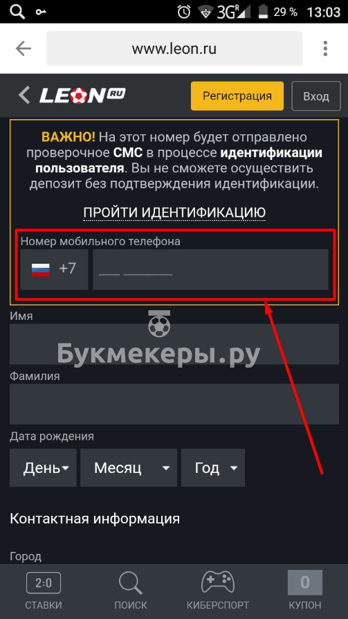 Чтобы зарегистрироваться нужно нажать на соответствующую кнопку в правом верхнем углу. Вводить необходимо достоверные данные. Leonbet, работает только с российскими пользователями. В графе номер телефона уже указан код России, номера других стран система отклонит.