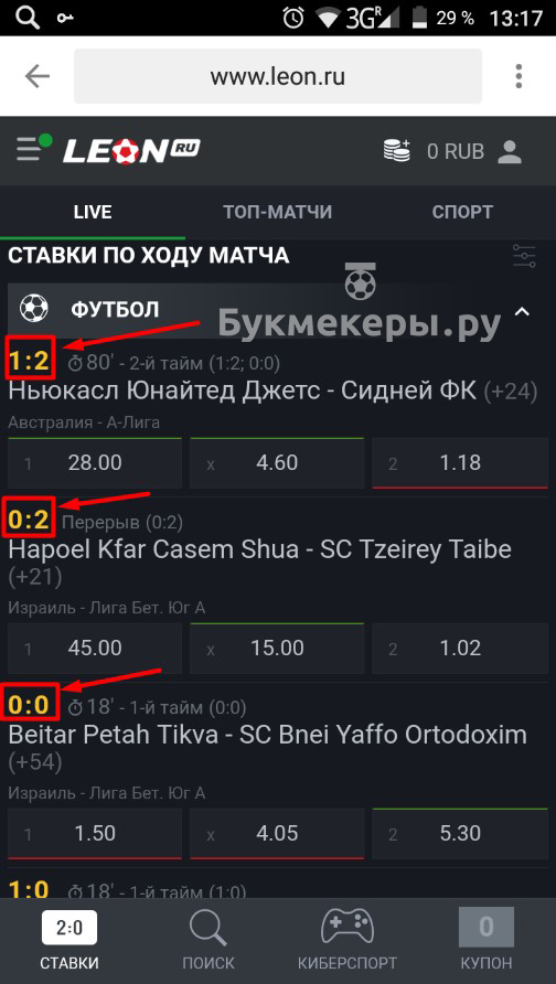 События на mobile сайте букмекера размещены по времени – вверху расположены, те, которые начались раньше. Чтобы узнать текущую позицию команд, не нужно открывать всю роспись матча – количество голов/очков указано рядов со временем.