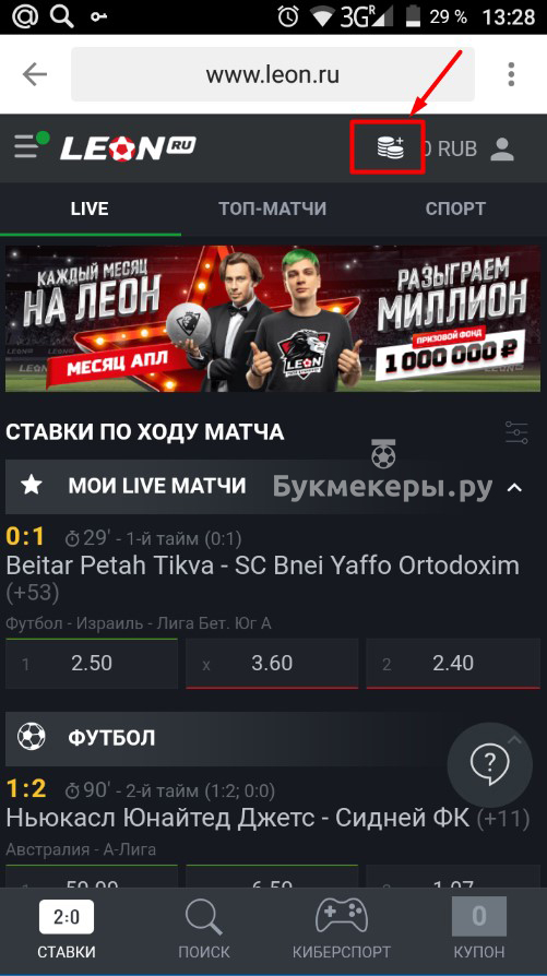 Чтобы пополнить депозит в Leonbets необходимо нажать на значок «монеты» в верхнем углу: