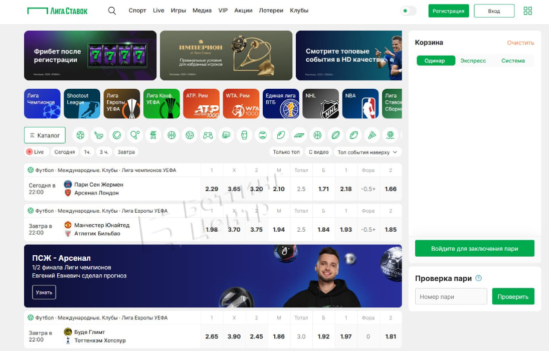 - Постоянное обновление коэффициентов по событиям, нажатие на них позволяет добавить его в «Корзину»;