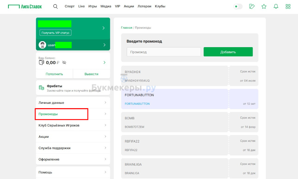 В ЛК букмекерской конторы есть раздел, который так и называется — “Промокоды”. Здесь находится поле, куда вносят комбинацию из латинских букв и/или цифр, а затем нажимают клавишу «Добавить». Одновременно с промо кодом можно использовать и другие бонусы.