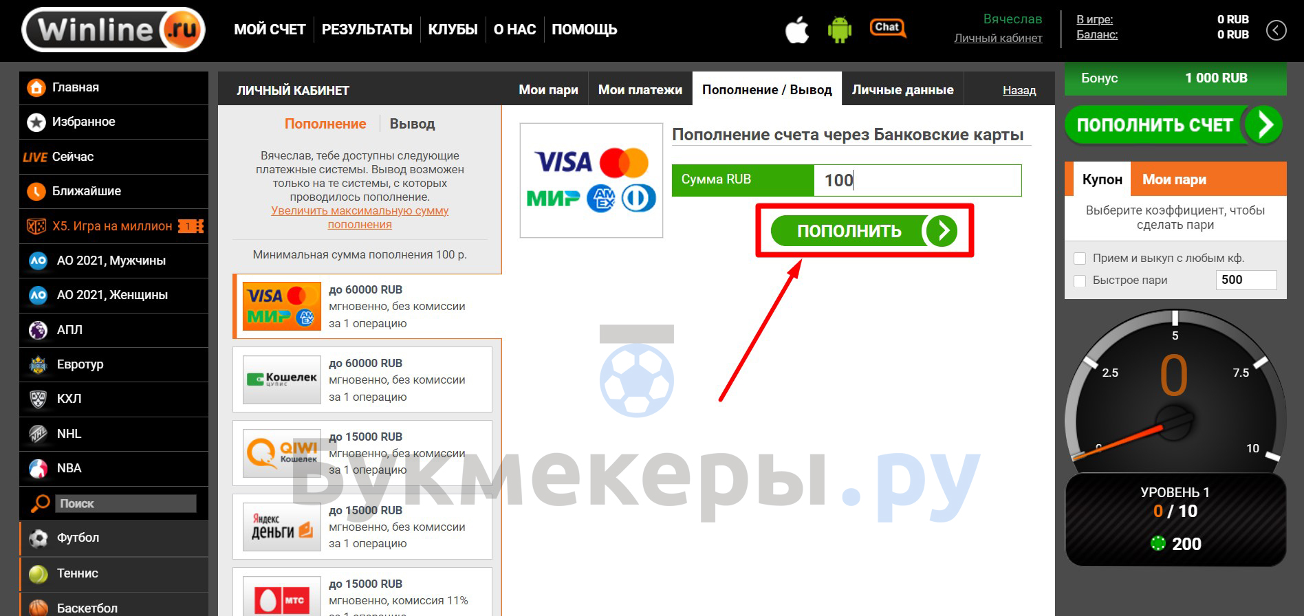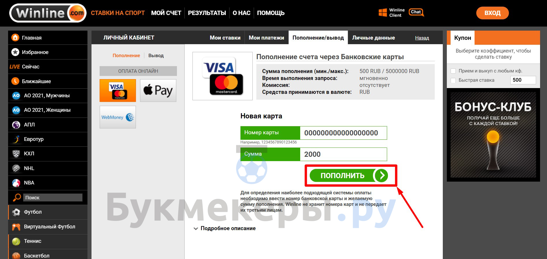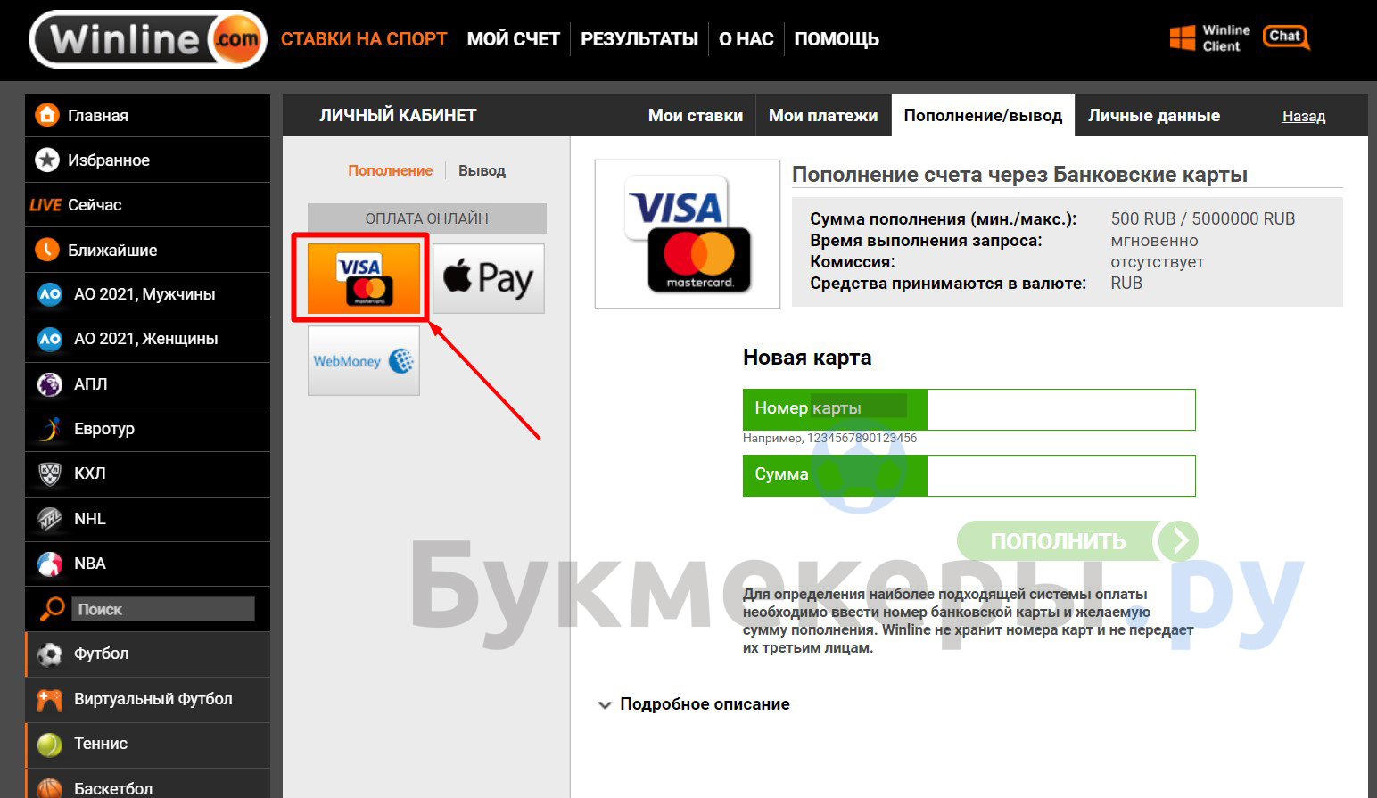 - Банковскими картами VISA, MasterCard, «Мир». В Winline деньги поступают моментально. При помощи банковской карты можно переводить до 60 000 руб. за одну операцию. Комиссия за пополнение не взимается.