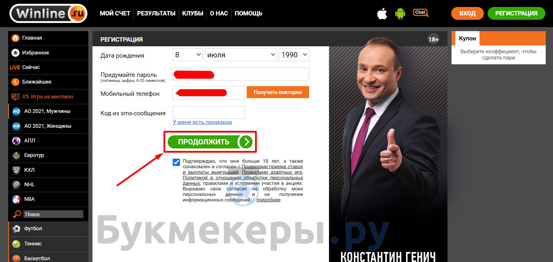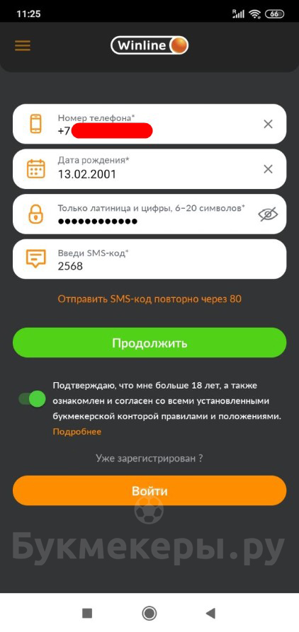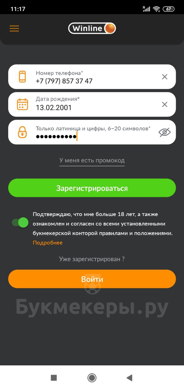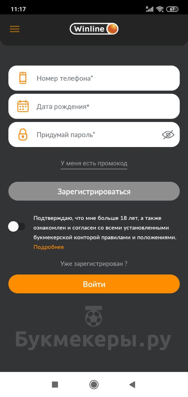 Зарегистрироваться через приложение для смартфонов можно схожим образом, как и через основной ресурс Винлайн. Загружаем программу на мобильный, открываем ее и система сразу предлагает создать аккаунт:
