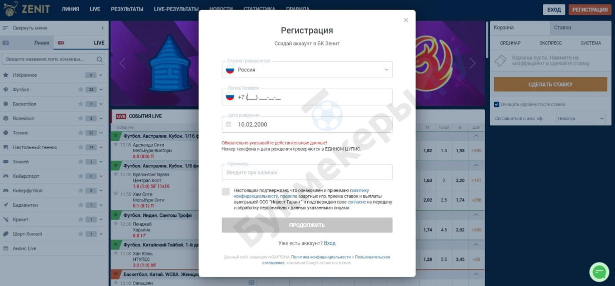 Регистрация в букмекерской конторе Зенит проходит так: