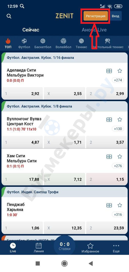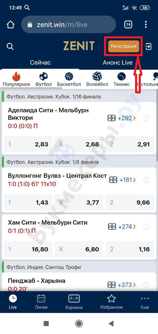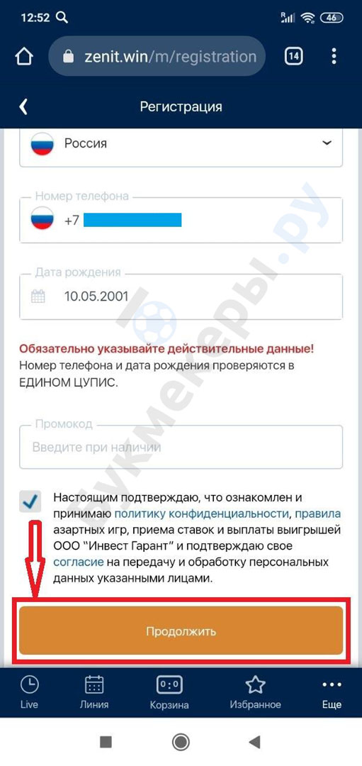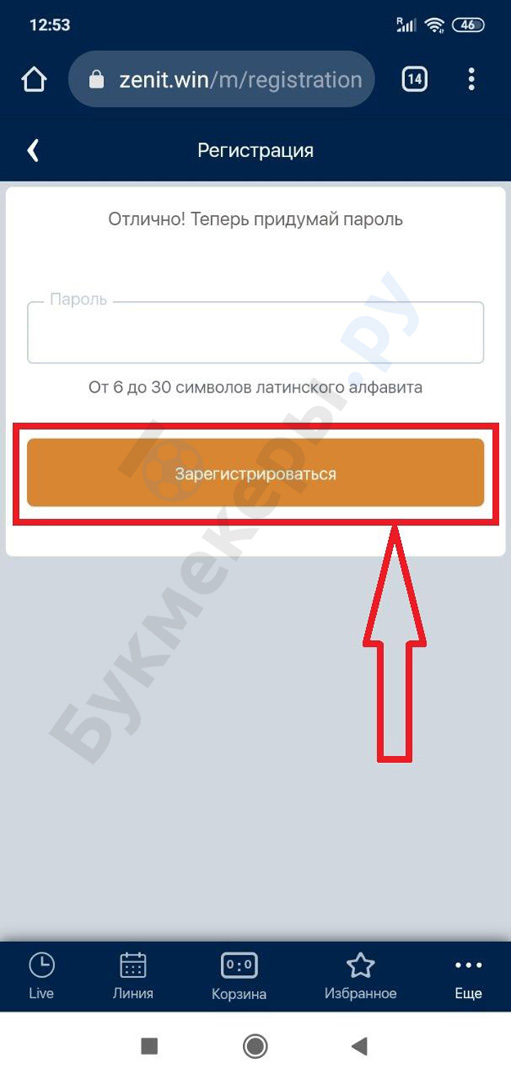 Регистрация в БК Зенит через мобильный сайт выполняется так: