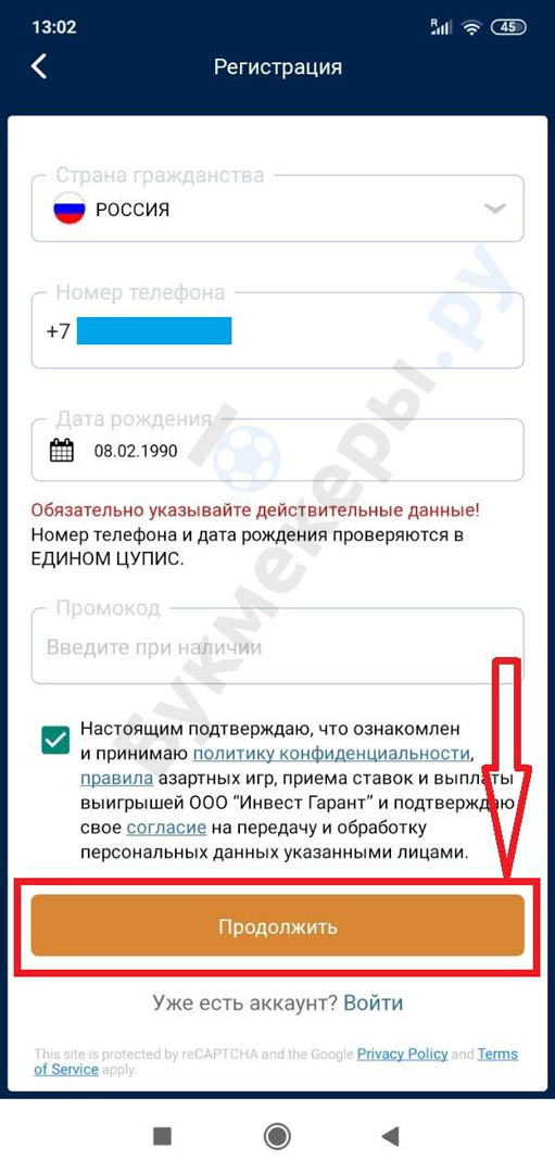 - Ввести в открывшуюся форму свой номер телефона, дату рождения, выбрать страну.